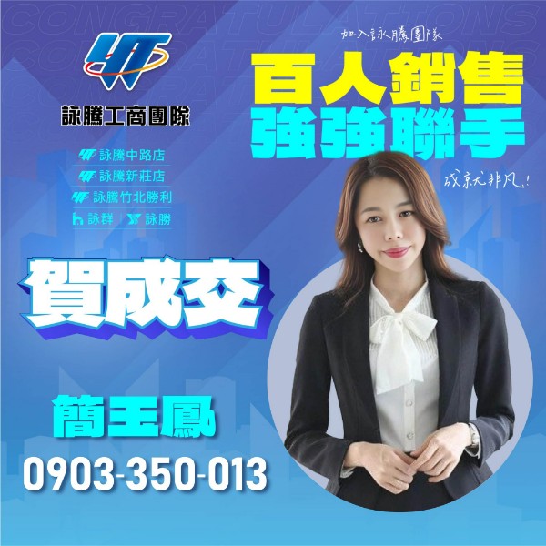 發佈: 13 小時前 點閱: 13 【詠騰💥破億💥TOP團隊-👑詠騰工商地產👑】🏆狂賀詠騰團隊👍#2024再度破億詠騰/詠群/詠騰新莊/詠勝/詠騰竹北👉持續成交不斷電 工業地產買賣租賃首選⚡️⚡️賀成交 大園廠房⚡️⚡️🏆🏆恭喜 阿儒 葉葉 玉鳳 雅琴🏆🏆✨團隊就是我們每個人都是一滴小水滴✨但聚在一起就能匯集成浩瀚海洋👍 詠騰商仲團隊【大桃園/雙北/竹北,百人大團隊】💥 強強聯手,您房仲商仲首選!我們有商仲百人團隊系統和資源支持👊🏻這就是大家為什麼想加入我們的原因🌟 加入我們,成就非凡! 🌟#誠徵房仲菁英#誠徵工仲商仲菁英#20年以上仲介實戰經驗帶你飛#新北桃園工業地產首選#工業地廠房買賣租賃超強團隊想更上一層樓、卻舉足不前不想放棄房仲 卻又想學習商仲現在 #詠騰 是你最好的選擇我們擁有TOP的商仲團隊只要你願意 一起加入我們詠騰歷年獲獎無數2021 #冠軍 全國第二季2021 #亞軍 全國第三季2021 #亞軍 全國年度2021 #冠軍 全國年度2022 #冠軍 桃園區第一季2022 #冠軍 全國第二季2022 #冠軍 桃竹苗年度2022 #亞軍 全國年度2023 #冠軍 全國第一季2023 #亞軍 全國年度2023 #冠軍 桃竹苗年度2024 #季軍 全國年度2024 #冠軍 桃竹苗年度✨ 2025人才養成培訓計畫 ✨這裡有最全面的培訓和支持,讓你從零開始成為頂尖經紀人華麗轉身、晉升超業,不再只是夢想!🏆 2025等你來創造佳績!☕☕ 聊聊沒損失,合作大有可能 ☕☕⛳詠騰中路店🧑🤝🧑太平洋房屋桃園詠騰工商加盟店⛳桃園區正光二街139號👉詠騰不動產有限公司👉經紀人:(102)彰縣字第00365號🏹營運中、擴大徵才中☎️0989-747-500 (蔡經理)🆔LINE ID:0989747500✅詠騰官網:https://www.yuteng.com.tw/⛳詠騰中正店🧑🤝🧑太平洋房屋桃園詠群工商加盟店⛳桃園區中正路1391號👉詠群工商地產股份有限公司👉經紀人:(107)桃市字第001700號🏹營運中、擴大徵才中☎️0955-138-868(賴店長) 🆔LINE ID:0955138868✅詠群官網:https://www.yungchun.com.tw/⛳詠騰新北店⛳五股區五工三路79號👉詠騰新莊不動產有限公司👉經紀人:(98)桃市經字第001008號🏹營運中、擴大徵才中☎️0900-269-286(劉店長)🆔LINE ID:0900269286✅詠騰新北店官網:https://www.yungye.com.tw/⛳詠騰中正藝文店⛳桃園區南平路448號🏹擴大徵才中☎️0916-078-268 (楊副總)🆔LINE ID:0916078268✅詠勝官網:https://www.yungsheng.com.tw/⛳詠騰竹北勝利店⛳竹北市莊敬五街118號🏹擴大徵才中☎️0915-062-055 (吳店長)🆔LINE ID:0915062055✅詠騰竹北官網: [https://www.ytzv.com.tw](https://www.ytzv.com.tw)