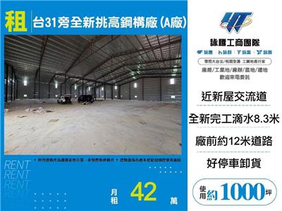 ※近新屋交流道、台66線及台31線 交通便捷 ※廠前約12米道路 好停車卸貨 ※全新完工滴水7米挑高鋼構倉庫廠 ※備電力設備